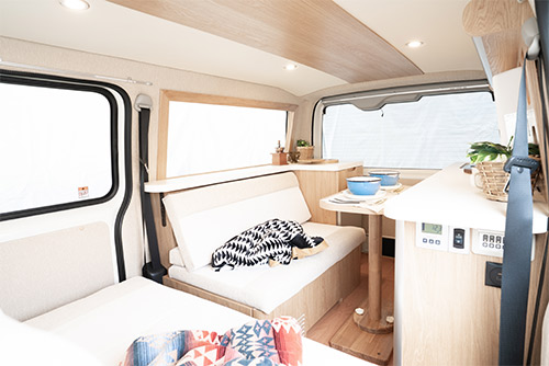 横向きソファとベッド構造を兼ね備えた「引き出しベッド型ソファ」を採用し、シーンに応じてレイアウトを変えることが可能です。セカンドシートを後ろ向きに展開すると、家族や仲間が自然と集まれるL字型のソファスペースとなり、旅先での団らんや休憩時に最適です。