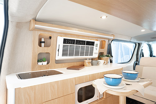 使い勝手がよく、スペースを多く取らないシンプルでスマートはキッチンの上部にはクーラーがオプションで設置可能です。クーラー配置スペースの両横にはカフェのような展示棚が標準で付いており、オシャレな空間を楽しみながら旅をすることができます。