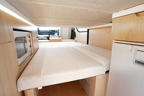 室内は限られたボディサイズを最大限に活かした、シンプルで使い勝手のいいレイアウトとなっております。動線を妨げない設計により、車内での移動や着替え、さらには荷物の出し入れまでスムーズに行うことができます。シーンに応じて柔軟に変化するレイアウト構成により、日中は家族団らんできるリビング、夜は快適な就寝スペースへとスムーズに切り替え可能。最大8名が乗車可能という標準ボディとは思えないゆとりある空間に、移動中も乗員全員が安心して過ごせる開放感と実用性を両立させた室内環境を備えております。