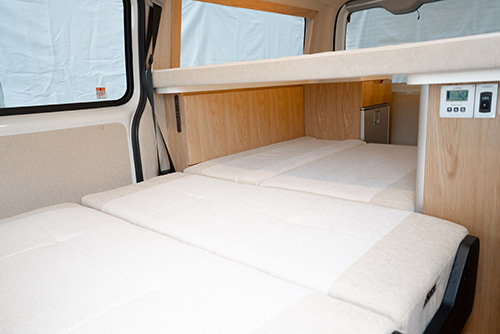 また、自動ベッド展開機構がシートに取り付けられているため、ベッド展開もスムーズに。様々なシーンに応じて変化ができます。ファニチャー上部にマットを装着するとチャイルドベッドが作れます。家族旅にも対応できる一台となっております。